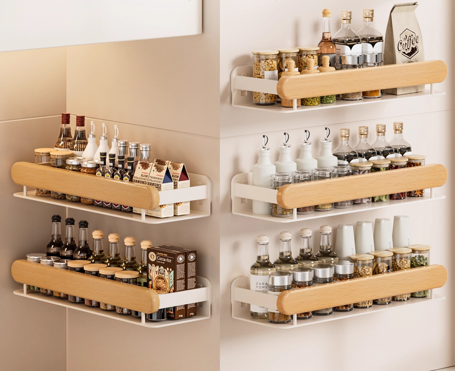 Wieszaki naścienne instaluje się bezpośrednio na ścianie, nad kuchenką lub obok zlewu, dzięki czemu butelki z przyprawami nie znajdują się na blacie. W małych kuchniach z wąskimi blatami ten projekt może zwolnić 30–50% miejsca na blacie – wystarczająco, aby umieścić deskę do krojenia lub mały garnek. Należy jednak wziąć pod uwagę również kwestie: na przykład, jeśli ściana jest wykonana z płytek lub płyt kartonowo-gipsowych, czy instalacja będzie stabilna? Większość stojaków naściennych jest wyposażona w mocne śruby samoprzylepne lub śruby rozporowe; stojaki samoprzylepne nadają się do gładkich ścian z płytek i wytrzymują ciężar 2-3 kg, natomiast wkręty rozporowe są lepsze w przypadku płyt kartonowo-gipsowych, dzięki czemu stojak nie spadnie nawet w przypadku cięższych butelek z przyprawami. Dodatkowo stojaki naścienne muszą znajdować się na rozsądnej wysokości – za wysokie, bo niewygodne jest wnoszenie przypraw, za niskie, co może zasłaniać wylot spalin z pieca. Aby zapewnić łatwy dostęp, ogólnie zaleca się wysokość 50–60 cm nad kuchenką.